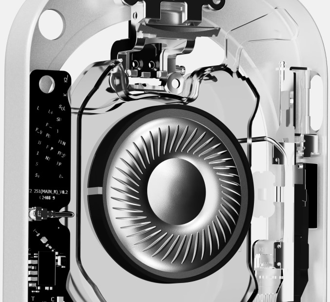 Aluminiul turnat intareste partile structurale cheie fara a adauga greutate inutila, in timp ce materialele plastice turnate cu precizie aduc flexibilitate si echilibru. O carcasa transparenta inveleste fiecare casca, dezvaluind ingineria din interior. La baza, o diafragma placata cu nichel intareste driverul pentru o durabilitate si o claritate imbunatatite, mentinand sunetul constant pe fiecare piesa.