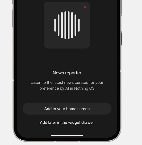 Stiri selectate si rezumate de AI, narate de directorul financiar al Nothing, Tim Holbrow. Numai pe sistemul de operare Nothing cu widgetul News Reporter.